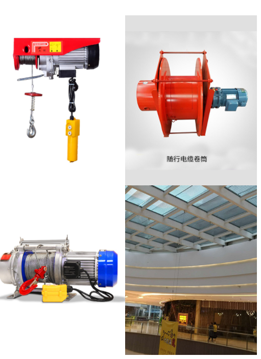 商場用電動提升機:現在每個商場基本都會使用商場廣告吊鉤,而這些廣告吊鉤大多是安裝在商場中庭邊緣的,通過導向輪把鋼絲繩引導過去然后垂下吊鉤,這樣在需要更換條幅的時候就只要輕輕一按,就可以放下吊鉤更換條幅了。